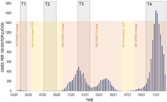 - Tolksdorf, K.; Loenenbach, A.; Buda, S. Dritte Aktualisierung Der “Retrospektiven Phaseneinteilung Der COVID-19-Pandemie in Deutschland”. Epidemiol. Bull. 2022, 38, 3–6. [Google Scholar] [CrossRef]