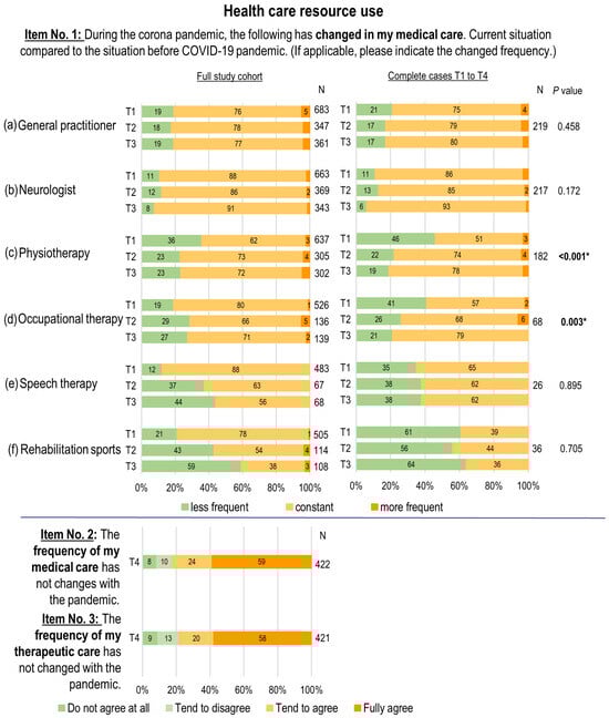 | Healthcare resource use | 1 | During the corona pandemic (current situation), the following has changed in my medical care. (If applicable, please indicate the changed frequency). Compared to before the pandemic, visits are less frequent/same/more frequent: (a) general practitioner, (b) neurologist, (c) physical therapy, (d) occupational therapy, (e) speech therapy, (f) rehabilitation sports. | x | x | x | |