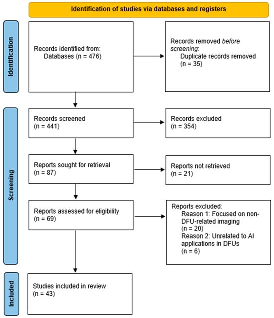 The initial search phase retrieved a total of 476 studies. Researchers uploaded the references to EndNote X8 [28], where they identified and removed duplicate records, reducing the number of studies to 441. They then screened these studies based on their titles and abstracts, excluding 354 studies irrelevant to DFU research or classified as review articles rather than original research. This process left 87 studies for full-text retrieval; however, they could not retrieve 21 reports. Following this screening process, researchers assessed 69 full-text studies for eligibility. They applied the predefined inclusion and exclusion criteria, leading to the exclusion of 26 studies. Ultimately, they selected 43 studies for full-text review. Researchers documented the entire process using a PRISMA flow diagram, which outlines the number of studies retrieved, screened, excluded, and included in the systematic review, as shown in Figure 1.