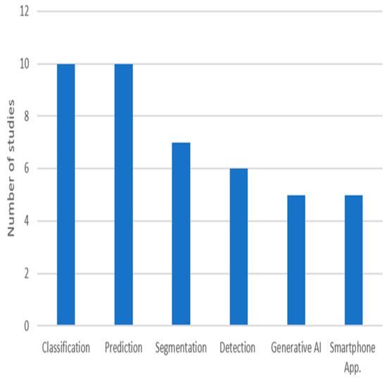 The integration of advanced technologies has become critical in addressing the complexities of DFUs, which remain a significant challenge to healthcare systems worldwide. Traditional DFU management methods, such as visual inspection and manual measurement, often produce variable outcomes due to differences in clinical expertise. With the growing incidence of diabetes, there is a need for innovative solutions that enhance diagnostic precision and reduce the risk of complications such as infections and amputations. Emerging digital solutions, particularly those powered by AI, have the potential to revolutionize DFU management by providing effective tools. AI-based techniques enable clinicians to achieve higher diagnostic accuracy and offer personalized care plans, even in resource-limited settings characterized by data scarcity and shortages in human resources. This section aims to explore how AI has transformed DFU-related tasks, including classification, prediction, segmentation, and detection, and to discuss its practical application in clinical practice for improving patient care. Figure 2 shows the number of reviewed studies for each task. Among these, classification and prediction have received the most attention in research, highlighting their fundamental role in DFU care.