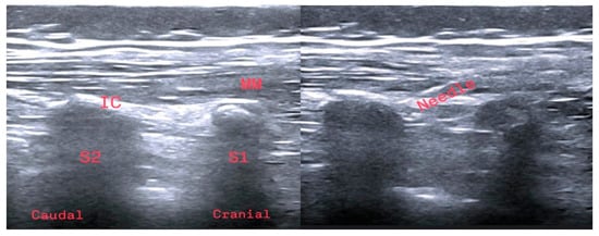 When Group S patients were under general anesthesia and before beginning surgery, they were positioned on the lateral side. Aseptic conditions were ensured for the block, and a linear ultrasound (US) probe (MyLab™ Five; Esaote Europe BV, Maastricht, The Netherlands) was placed on the L5 vertebra spinous process in the sagittal plane to identify the starting point of the sacrum. The probe was moved caudally to visualize the sacral medial crest. Continuing in the lateral direction, the probe was used to locate the intermediate sacral crest. After obtaining an optimal US image at the S2 level, a block needle (50 mm, 21G short bevel) (Stimuplex A, B. Braun, Germany) was advanced craniocaudally until bone contact was achieved. Before LA injection, the needle was aspirated to exclude inadvertent intravascular placement of the tip. Marcaine (0.25%; 0.5 mL/kg; maximum 10 mL) was injected between the multifidus muscle and the intermediate sacral crest. The same block procedure was repeated on the patient’s other side (Figure 1).
