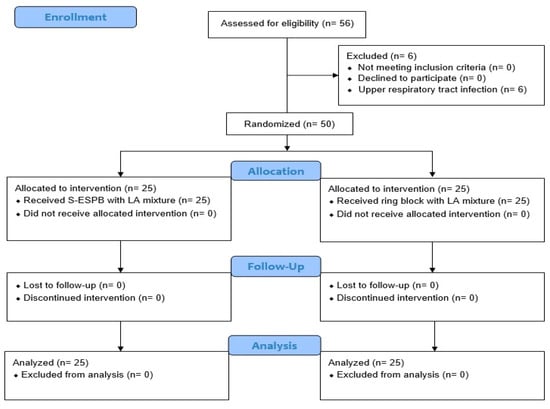 The primary outcome of this study was the postoperative FLACC scores 1 h after surgery. A 2-point difference in FLACC scores 1 h after surgery was considered clinically important []. A pilot study including both the ring block group (n = 10) and the S-ESPB group (n = 10) was conducted to determine the sample size. In the ring block group, the postoperative FLACC score at 1 h after surgery was 4.1 ± 1.9, whereas it was 2.0 ± 0.82 in the S-ESPB group. Based on these data, using an independent groups t-test model with a Cohen’s D effect size of 1.052, it was calculated that each group would need 21 patients to achieve 95% power with a maximum type I error of 5%. Considering the potential dropout rate, the required sample size was determined to be 25 patients per group, resulting in a total of 50 patients. The study was stopped when the specified 50 patients were reached.