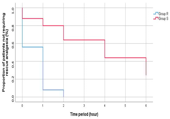 At the end of the study, postoperative rescue analgesia was applied to 88% of all patients (44 patients). When the groups were compared in terms of rescue analgesia application, the time until the first analgesic requirement was shorter in Group R patients than in Group S, and this difference was statistically significant (1 [0–1] vs. 4 [2–6]; p = 0.002) (Figure 3).