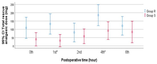 The changes in rescue analgesic doses in different time intervals. *, p < 0.05; mg, milligram; CI, confidence interval.