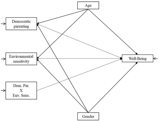 To test whether democratic parenting interacts with adolescent’s environmental sensitivity in predicting their well-being, three path analysis models were specified (one for each well-being component), with a predictor (democratic parenting), a moderator (environmental sensitivity), an interaction term (democratic parenting x environmental sensitivity), and an outcome (well-being component). Both the predictor and the moderator were standardized before computing the interaction term. We statistically controlled for gender and age effects on outcomes, predictors, and moderators. The Maximum Likelihood (ML) estimation method was used. The overall fit of each model was tested using several goodness-of-fit statistics and an evaluation of the appropriateness of the model parameters. The χ2 statistic assessed the implied covariance matrix compared with a good-fitting model indicated by a non-significant result. Given the potential limitation of the χ2 test (it should be non-significant with p > 0.05), due to its tendency to reject the null hypothesis with large sample sizes and complex models, we relied on well-known goodness-of-fit indices and their related cut-offs to evaluate model fit [50]: CFI ≥ 0.90 for acceptable and ≥0.95 for good fit, RMSEA ≤ 0.08 for acceptable and ≤0.05 for good fit. We probed interactions using simple slope analyses: simple slopes were tested at high and low levels of environmental sensitivity (±1 SD) consistent with recommended practices [51].
