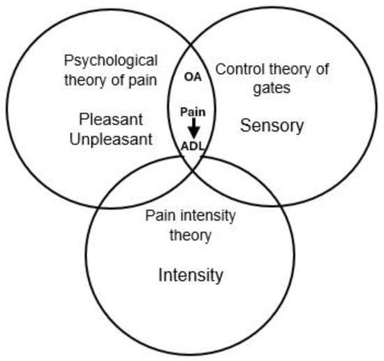 Relationship between pain theories in OAs and their ADLs. Source: model of pain in OAs under pain intensity theory (1874), gate control theory (1965), and psychological theory of pain (1965).
