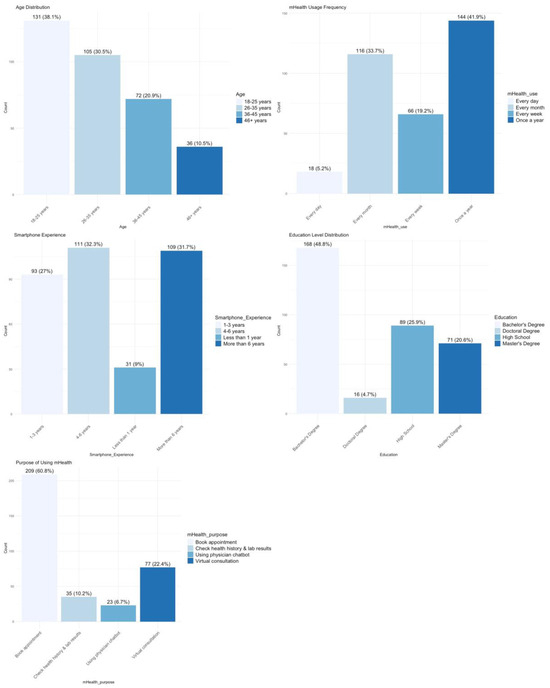 Figure 1 presents the demographic distribution of participants categorized by app usage frequency, smartphone experience, age, education level, and purpose of using mHealth applications, illustrating key trends in mHealth adoption across different user groups. The data indicate that younger adults, particularly those aged 26–35 years (105 participants, 25.1%), represent the largest group of mHealth users, followed by those in the 18–25 years category (79 participants, 20.2%). The frequency of app usage also varies, with a significant proportion of users engaging with the Sehaty app daily or weekly (144 users, 34.1%), reflecting a high reliance on digital healthcare services. Similarly, smartphone experience data reveal that most participants have been using smartphones for over 6 years (190 participants, 71%), demonstrating a well-established familiarity with mobile technology. In contrast, only 31 participants (11%) reported having 1 to 3 years of smartphone experience, suggesting that digital literacy is generally high within this sample.