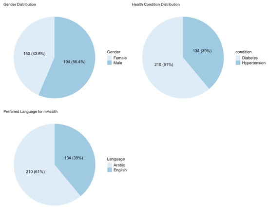 Figure 2 illustrates the demographic distribution of participants categorized by gender, health condition, and preferred language for mHealth applications, providing insights into the user characteristics and language preferences that may influence mHealth adoption and engagement. The first chart presents the gender distribution, revealing that the majority of participants were male (194 participants, 56.4%), while females constituted 150 participants (43.6%). This suggests a relatively balanced gender representation among the respondents, though with a slightly higher proportion of male users. The second chart illustrates the distribution of health conditions among participants, with hypertension being the most commonly reported condition (210 participants, 61%), followed by diabetes (134 participants, 39%). These findings indicate that a significant portion of Sehaty users rely on the application for managing chronic diseases, reinforcing the importance of mHealth platforms in supporting long-term disease management.