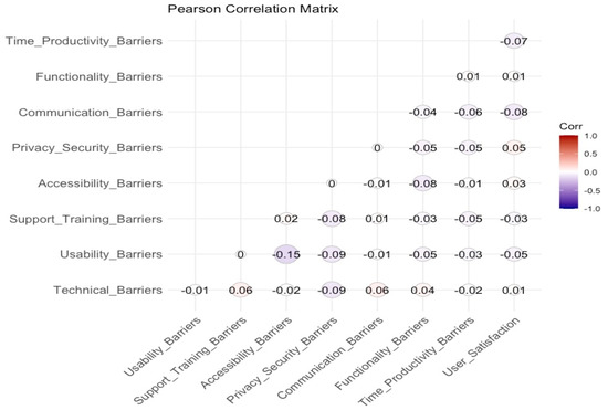 The correlation analysis, as illustrated in Figure 3, reveals moderate correlations between accessibility and support barriers, as well as between time and productivity constraints and cost-related barriers. These findings suggest that accessibility challenges often stem from insufficient training or support, while time management inefficiencies are closely linked to broader accessibility limitations. In contrast, weak correlations between factors such as cost and technical barriers indicate that certain challenges may operate independently. These results underscore the need for a comprehensive approach to application enhancement, with a focus on technical reliability, usability, security, and accessibility to improve user satisfaction and effectively mitigate barriers.