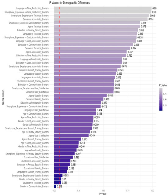 As illustrated in Figure 4, the analysis of statistical differences across demographic factors and perceived barriers reveals that most comparisons do not exhibit statistically significant variation. The majority of p-values exceed the conventional threshold of 0.05, indicating that demographic characteristics, such as gender, age, education, language, and smartphone experience, do not significantly influence participants’ perceptions of the identified barriers. However, a statistically significant difference was observed in the relationship between gender and communication barriers (p = 0.018), suggesting that males and females experience communication-related challenges in distinct ways.