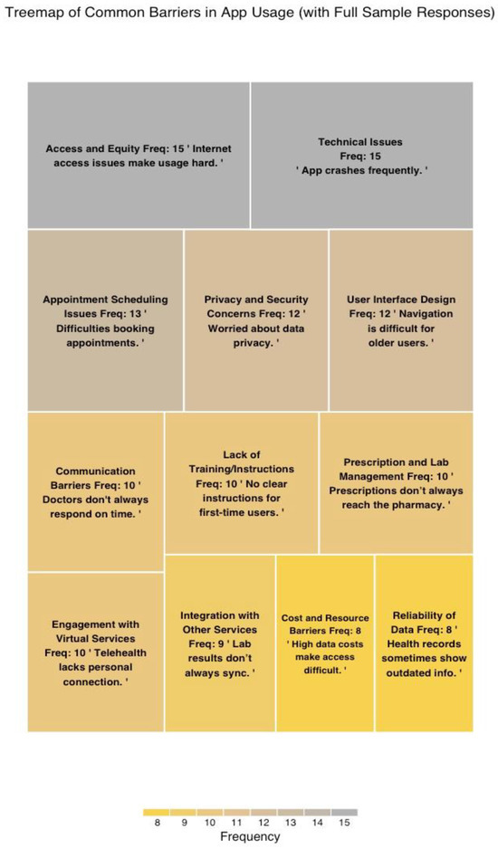 The qualitative analysis of open-ended responses identified 12 key themes related to the challenges patients face when using mHealth applications, including telehealth, virtual consultations, and follow-up services (see Figure 5). The most frequently mentioned themes were Technical Issues and Access and Equity, each cited in 15 responses (12.1%). Patients frequently expressed dissatisfaction with recurrent application failures, prolonged loading times, and unreliable internet connectivity. Similarly, concerns regarding equitable access, including unstable internet connections and language barriers, were prominent, emphasizing the need for improved infrastructure and inclusive application design.