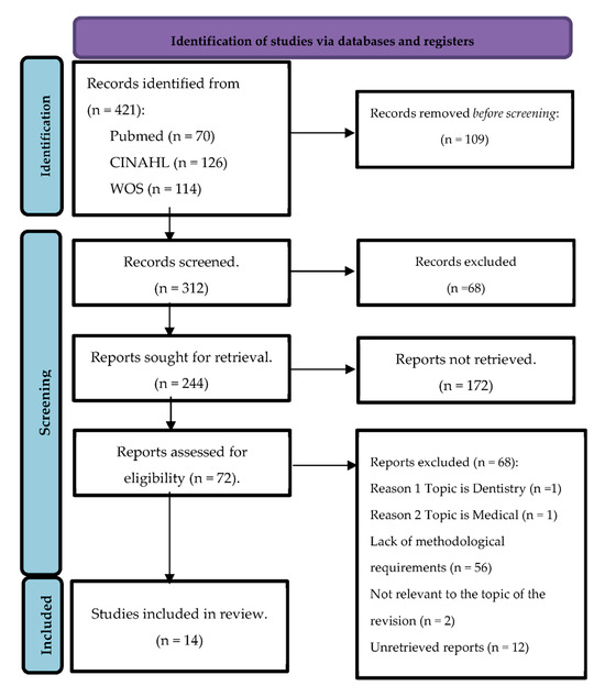 Were identified 421 publications and 97 duplicates were eliminated. During a quick review of the titles and abstracts of the included articles, we identified and included 14 other relevant publications using the “links to similar articles” browser in the database of the researched platforms. The PRISMA (Preferred Reporting Items for Systematic Reviews and Meta-Analyses) protocol, which provides a structured approach to conducting and reporting systematic reviews, was used to present the results of the literature review [31] in Figure 1. This protocol ensures transparency and completeness in reporting the process of identifying, selecting, and synthesizing relevant studies.