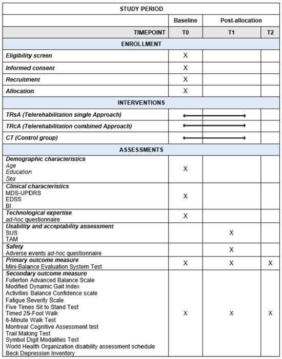 SPIRIT figure for the schedule of enrollment, interventions, and assessments in the pragmatic trial. T0 = baseline (pre-intervention phase); T1 = post-treatment assessment (5 weeks after baseline); T2 = follow-up assessment (12 weeks after the end of the treatment). MDS-UPDRS: Movement Disorder Society—Unified Parkinson’s Disease Rating Scale; EDSS: Expanded Disability Status Scale; BI: Barthel Index; SUS: System Usability Scale; TAM: Technology Acceptance Model.
