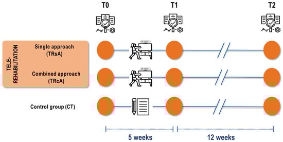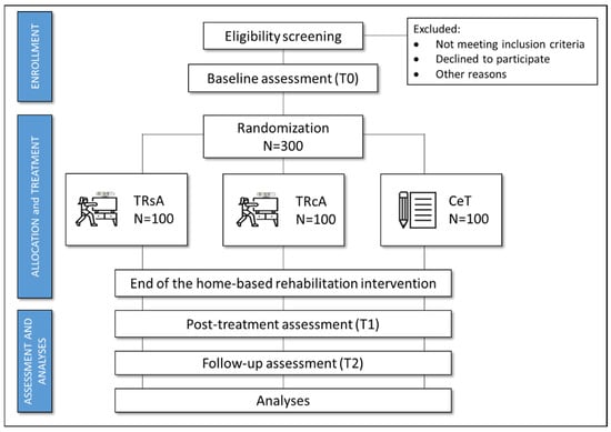 Following enrollment and the baseline assessment, each participant will be randomly assigned into one of the following three groups, with an allocation ratio of 1:1:1: (1) telerehabilitation single approach (TRsA, experimental group); (2) telerehabilitation combined approach (TRcA, experimental group); or (3) conventional educational treatment (CeT, placebo comparator).
