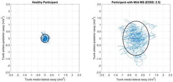 Trunk medio-lateral and antero-posterior sway, expressed as the root mean square of the acceleration detected by the IMU on lower back, in a representative healthy participant (left panel) and in a representative person with mild MS (right panel), during standing on foam with eyes close. Note the larger oscillations in the participant with MS, meaning unstable static balance.