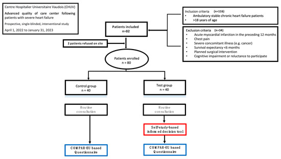 The questionnaire aimed to evaluate factors necessary to implement sustained decisions as identified by the recommendations of the COMPAR-EU project [14,15]; statements 1 to 3 investigated decision tool factors, in particular, the understanding of the information that “HF is a whole life duration disease” and that “HF treatment with foundational drugs has beneficial short- and long-term effects”; statement 4 investigated individual health professional factors, asking whether the “study participant’s appraisal of the benefit of life-long medical adherence is compatible with the individual’s vision of his life”; statements 5 and 6 explored interaction and organizational factors such as whether comprehension is sufficient to take a decision, or whether additional information is afforded; statement 7 tested study social factors, in particular, participant’s readiness to take a decision. The wording of statements 5 and 6 differed between the test and the control groups in order to acknowledge exposure/non-exposure to the self-study-informed decision-making tool (Figure S2). In the control and test questionnaire, all statements but statement 5 were similar. In the control group, statement 5 was “I understand the different aspects of my heart disease”, whereas test group statement 5 was “Following the presentation, I have new questions that remain unanswered”. Both statements evaluated the need for further information, taking into consideration that only the test group participants were exposed to the information tool. Using the Likert scale, each statement was graded for agreement (grades of agreement: 0 = not at all, 1 = rather no, 2 = rather yes, 3 = yes, 4 = absolutely). The total score is the sum of the grades for the 7 questions. Patients were encouraged to provide written feedback and comments (Tables S2 and S3).