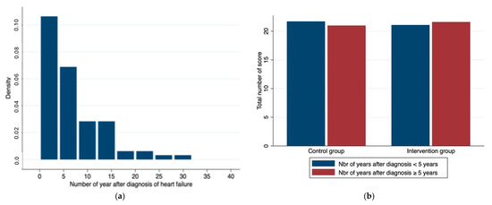 (a) Distribution of the number of years after HF diagnosis in all study participants. (b) Mean total score per group of patients in each group analyzed as a function of the number (Nbr) of years with HF (heart failure) diagnosis (<5 years versus ≥5 years). The mean duration of HF was not different between the intervention vs. the control group.