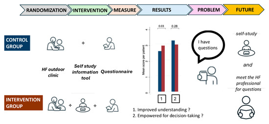 The results of this study show that a self-study-based informed decision-making tool increases the understanding of and agreement with essential elements of HF treatment. In the test group participants, self-study was associated with the presence of remaining questions, suggesting that a face-to-face encounter with a health profession would complement the self-study tool. The addendum of a face-to face encounter may question the importance of the self-study-based information tool, but a self-study-based information tool not only imparts knowledge that by itself can decrease intentional non-adherence [30], as self-study also helps to define one’s own intentions, and facilitate the development of realistic expectations based on the clarification of one’s own short- and long-term goals. Therefore, a face-to-face encounter will answer knowledge-related questions, but likewise provides the option to consider the multimodality of the decision-making process to improve timing in decision-taking (Figure 3).