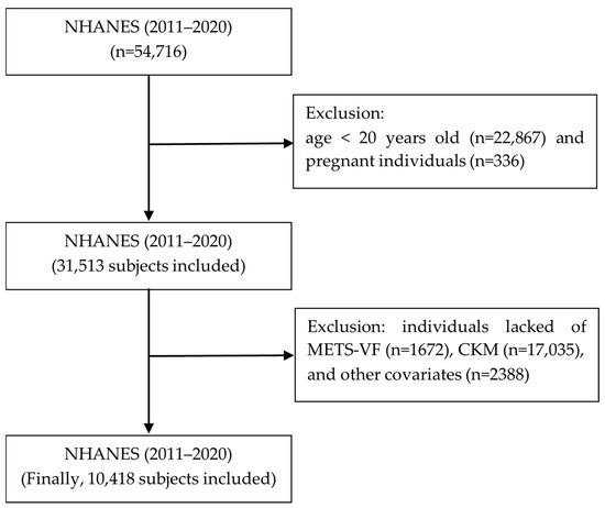 APA StyleFang, X., Yin, X., Liu, Q., Liu, J., & Li, Y. (2025). Correlation Between Metabolic Score for Visceral Fat and Cardiovascular-Kidney-Metabolic Syndrome: Analysis of NHANES 2011–2020. Healthcare, 13(7), 694. https://doi.org/10.3390/healthcare13070694