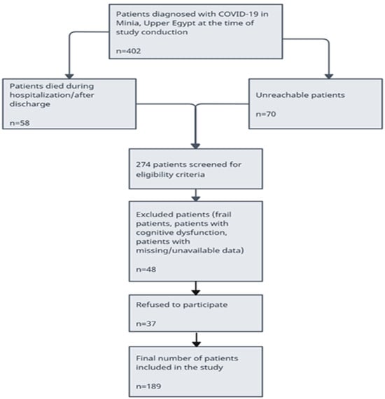 The sample size of 189 participants was determined based on feasibility and data availability, ensuring adequate representation of both hospitalized and non-hospitalized COVID-19 survivors in Minia, Egypt. Additionally, this sample size is comparable to similar studies investigating long COVID prevalence in other settings [