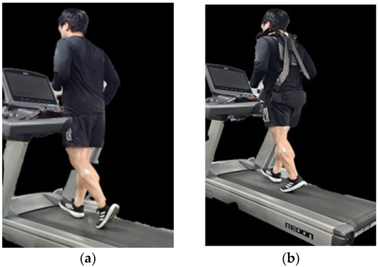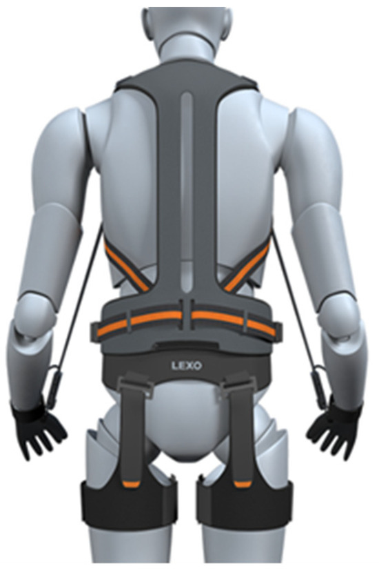 The LEXO-V Wearable Robot (Hancom, Yuseong-gu, Daejeon, Republic of Korea) is a non-powered strength-assist exoskeleton designed to reduce muscle strain and support walking. This device provides external support to enhance mobility and prevent injuries in both industrial and rehabilitation settings [27]. The LEXO-V Wearable Robot used in this study is designed to assist with walking by providing external support to reduce muscle load and enhance mobility. It features motors and actuators that help facilitate movement, allowing the wearer to walk more efficiently while minimizing fatigue. It is worn during gait analysis to measure its effects on muscle activation in participants. This wearable robot is a non-powered strength-assisting exoskeleton that is comfortable and easy to wear, like clothing. It supports the wearer’s lower limb strength, making it easier and more convenient to lift heavy objects. The device firmly supports the waist, shoulders, and legs, promoting proper posture and helping prevent injuries. The exoskeleton was adjusted to fit each participant individually. It reduces working time by 33%, decreases metabolic energy consumption by 32%, and improves work endurance. Additionally, it helps prevent musculoskeletal injuries. The product weighs 2 kg, supports a maximum load of 30 kg, and is adjustable to different sizes. The front of the device is equipped with a shoulder harness, chest harness, and a wire lock/release switch, while the rear features a spine support, waist harness, wire fixation module, thigh harness, and gloves (Figure 3).