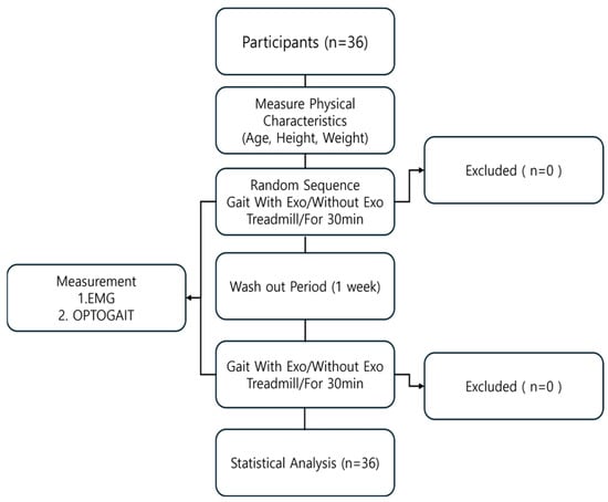 A total of 36 participants completed a treadmill walking session at a constant speed of 1.7 km/h in 30 min. The experiment consisted of two conditions: walking with and without the exoskeleton. These conditions were alternated within the same session, ensuring identical walking parameters for comparison.
