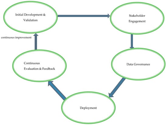 - Continuous Evaluation and Feedback: The sustained efficacy, ethical alignment, and adaptability of AI tools post-deployment are ensured through continuous evaluation and feedback mechanisms. Monitoring performance and impact using key performance indicators (KPIs) and health outcomes facilitates the identification of areas for improvement. Feedback loops involving end-users provide insights that drive iterative refinements and updates to AI systems, maintaining their relevance and effectiveness in evolving healthcare landscapes. This dynamic process addresses emerging challenges and upholds the ethical integrity and long-term success of AI integrations within clinical practice.