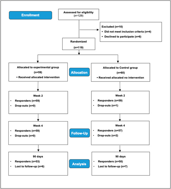 A total of 119 subjects with WL were recruited from emergency services of the Clinic Hospital of Terrassa. Prior to study, participants were randomly divided into two groups, MAN-Group (n = 59) and RHB-Group (n = 60), using the random number generator of a statistical program (SPSS version 24) to receive 3 and 20 treatment sessions, respectively (Figure 1). A single-blind study was performed because baseline measures were collected before randomization, and the outcome assessments were blinded. On the other hand, the patient did not know which procedure, experimental or control therapy, was going to be applied.