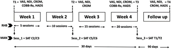 Sequence of treatment and outcome measures. VAS, Visual Analogic Scale; NDI, Neck Disability Index; CROM, Cervical Range of Motion; COOB-Rx, angular radiographic measurement using the Cobb method; HADS, hospital anxiety and depression scale; T1 to T4, first to fourth assessments; SAT, Specific Adjustment Technique in vertebral levels; Sess_1 to 3, sessions of treatment; MAN, experimental manipulation group; RHB, control rehabilitation group.