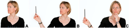 Ocular and cervical exercises. (A) Cervical exercises. Patient performs flexion and extension, left and right rotation, and side bending; (B) ocular exercises. Patient performs ocular movement in some directions without neck movement; (C) ocular and cervical exercises combined.