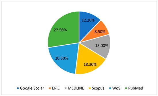 The process of data collection, analysis, and study elimination is illustrated in Figure 1. An initial search across the selected databases identified 378 potential studies. After removing duplicates, screening abstracts and titles, and applying other exclusion criteria, 60 papers remained. Following a more detailed eligibility assessment, 38 papers were excluded, leaving 22 studies that met the predefined inclusion criteria and were included in the systematic review. The full procedure for study selection and analysis is presented in Figure 1, the distribution of research by databases is presented in Figure 2, the comparison of the effectiveness of VR and TR across different categories is presented in Figure 3, and the meta-analysis forest plot figure, with the effects of VR-based interventions across various domains in Figure 4.