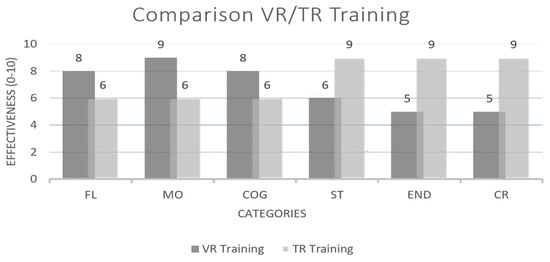 Comparison of the effectiveness of virtual (VR) and traditional (TR) training across different categories. Legend: FL—Flexibility, MO—Motivation, COG—Cognitive, ST—Strength, END—Endurance, and CR—Cardiorespiratory.
