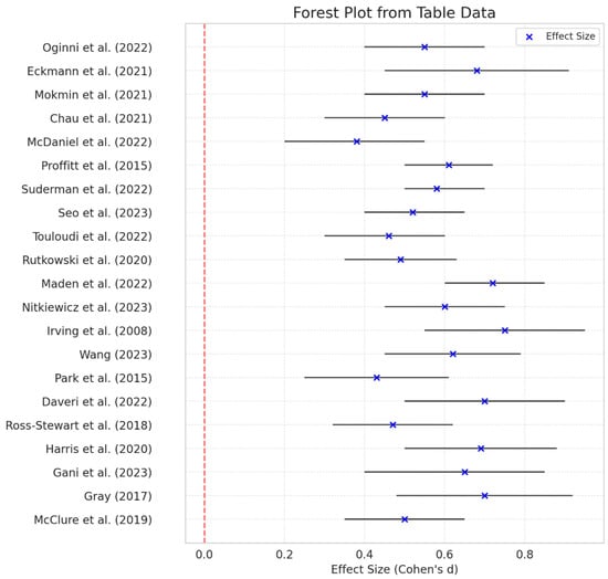 The findings of this meta-analysis (Table 5; Figure 4) provide valuable insights into the effects of virtual reality (VR)-based interventions across various domains, as demonstrated by the studies included in the final forest plot and summary table. The calculated effect sizes (Cohen’s d) consistently indicate a positive impact of VR interventions, with values ranging from 0.38 to 0.75, suggesting moderate to strong effects depending on the specific study.