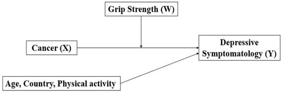 Descriptive statistics were calculated for all variables (means, standard deviation, and frequencies) for the entire sample and stratified by sex. The comparison of depressive symptomatology between males and females according to cancer diagnosis was tested by an independent sample t-test. The correlation between grip strength and depressive symptomatology was assessed by a Pearson correlation analysis [22]. The moderation analysis of grip strength (moderator, W) on the relationship between cancer (categorical, X) and depressive symptomatology (continuous, Y) was based on the moderation paths proposed by Baron and Kenny [23], as shown in Figure 1. Andrew Hayes’ PROCESS macro-3.5 was used to conduct the moderation analysis stratified by sex. For this simple moderation model, the process macro automatically centers the variables, computes the interaction term, runs the regression model with the interaction term, and then tests the simple slopes. The Johnson–Neyman approach was applied to test statistically significant interactions and identify regions of significance. This procedure was also used to obtain a threshold of statistical significance. Analyses were stratified by sex and controlled for a series of covariates (e.g., physical activity, age, country). Data analysis was performed using IBM SPSS Statistics version 28 (SPSS Inc., an IBM Company, Chicago, IL, USA). For all tests, the statistical significance was set at p < 0.05.