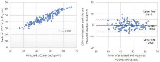 The analysis of all variables measured in this study was performed using the SPSS 25.0 for Windows (IBM Corp., Amonk, NY, USA). Multiple regression analysis was conducted to develop a VO2max predictive equation using height, weight, and the results measured during the Cooper test (running distance, average heart rate, and maximum heart rate) while wearing a smartwatch. The variance inflation factor (VIF) was assessed, and the VIF values ranged from 1.825 to 3.984, indicating that there were no issues with multicollinearity. Bland–Altman analysis was used to verify the agreement between the directly measured results and the predicted results, and the limit of agreement (LoA) was calculated to assess the consistency of the developed estimation equation. The LoA was calculated as the ratio of the standard error to the mean error within the calculated confidence interval (%, limit of agreement). To validate the developed prediction model, the traditional Cooper test estimation equation was also analyzed using Bland–Altman analysis. Consistency between the measured and predicted values was evaluated using the intraclass correlation coefficient (ICC) with the Two-way Random Effects Model and coefficient of variation (CV). Simple regression analysis was performed to examine the accuracy of the VO2max values predicted by the two estimations in comparison to the criterion-measured VO2max. The significance level for all statistical tests was set at 0.05.