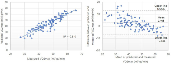 However, there were some limitations to this study. First, the participants were Korean adults aged from 23 to 54, and changes in VO2max according to age were not considered. Second, caution should be exercised when applying this prediction model to other racial groups. Race is one of the important factors that explain the differences in VO2max [31]. To develop a more precise prediction model, age-related factors should be considered, and validation across different racial groups is necessary. Third, the regression model employed in this study assumes a linear relationship and is tailored to the specific dataset, which may lead to reduced predictive performance when applied to new data. Furthermore, a previous study has indicated that recalibrating predictive models can improve their accuracy [32]. Therefore, future research should focus on expanding the validation sample and exploring the use of various modeling techniques to enhance the generalizability and precision of the model.