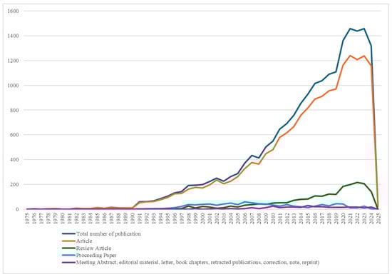For comparison, Table 2 and Figure 2 depict the publication trends relating to colorectal cancer and its surgical treatment without including sarcopenia. Compared to Figure 1, this visualization underscores the significantly higher volume of publications in this domain, with research dating back to 1975. The broader thematic scope resulted in a wider variety of document types, including conference abstracts, editorials, and book chapters. The rapid increase in publications post-2010 suggests an expansion of prognostic factor analysis, reflecting advancements in surgical techniques, risk stratification, and patient outcomes.