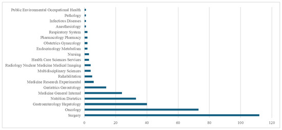 Web of Science research areas encompassing the identified scientific publications examining sarcopenia as a prognostic factor for surgical treatment outcomes of colorectal cancer.