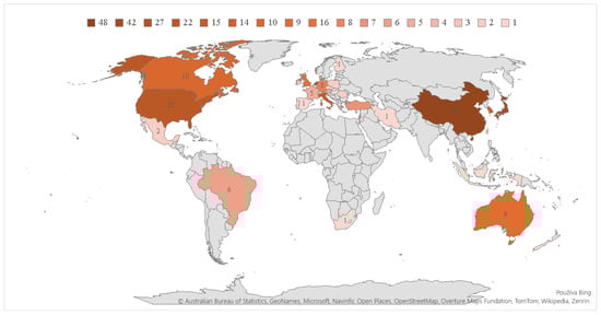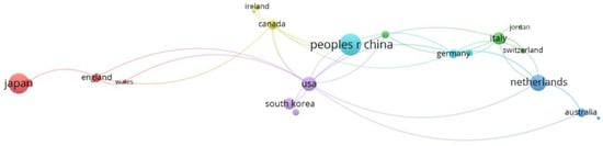 Figure 6 shows a bibliometric map that classifies six color-differentiated clusters of 20 collaborating countries. The size of each node corresponds to the publication volume, while the thickness of the connecting lines indicates the strength of collaborative ties. The country with the highest number of publications is China (48 publications, 3 links, total link strength 3), followed by Japan (42, 1, 1) and the Netherlands (27, 5, 7). These numbers indicate that while China and Japan lead in publication output, they engage fewer in international collaborations compared to their European counterparts. Conversely, the Netherlands exhibits the highest citation count (1607), suggesting its influential role in this research domain. This is followed by Japan (1090) and China (882). The classification of countries into clusters is as follows:
