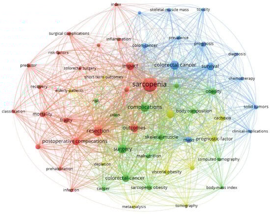 Within the keyword analysis of research on sarcopenia as a prognostic factor for the outcome of surgical treatment of colorectal cancer (RQ4), a total of 845 keywords were identified (442 author keywords and 498 KeyWords Plus). To enhance interpretability, only those keywords appearing at least 10 times in the publications were included in the analysis. The resulting bibliometric map in Figure 8 presents a network of keywords grouped into four thematically distinct clusters, each represented by a different color. Each cluster reflects a specific thematic area of research. The classification of the 57 keywords is as follows: