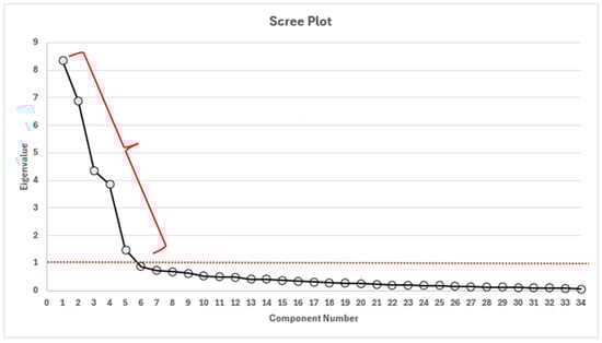 51]. The relationship between the number of factors (component number) and the eigenvalue in the graph can give an idea of the ideal number of factors. The eigenvalue is the amount of information carried by each factor. The number of factors that carry the largest amount of information, and at the same time do not carry a significantly low amount of information, can be interpreted as an ideal. Looking at the graph, there is a structure that contains a high amount of information up to the 5th factor; therefore, there is a rapid decrease in the eigenvalue. The bend between the 5th and 6th factors can be interpreted, as the factors to be created after this point contain a very small amount of information. Therefore, based on the slope scatter plot, it can be said that the ideal number of factors should be 5, and the factors created after the 5th factor will not contain significant information.