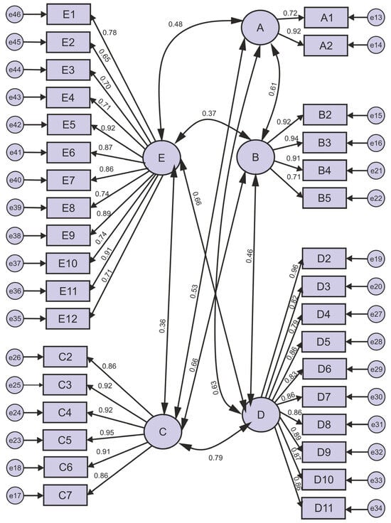50]. According to the fit criteria of the applied confirmatory factor analysis, sufficient reliability results were obtained. As a result of the CFA conducted with the data of the main study, it was found that the factor loadings of the items belonging to the scale were between 0.65–0.97. The t-values, which express the level of statistical significance of the relationships between the items and the latent variables, were found to be significant at the