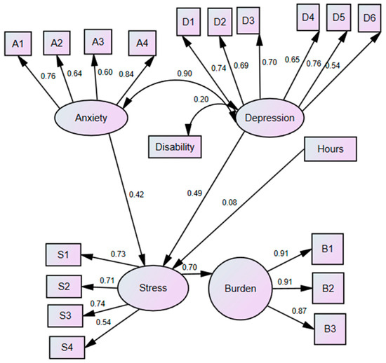 The level of disability and hours of care were included as observed variables, while the remainder were treated as latent variables. The level of disability and hours of care were considered exogenous variables, stress and caregiver burden as endogenous variables, and caregiver burden was the final endogenous variable.