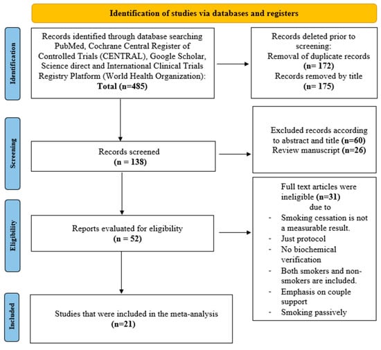 The authors searched the databases: PubMed, Cochrane Central Register of Controlled Trials (CENTRAL), Google Scholar, Science Direct, and International Clinical Trials Registry Platform (World Health Organization) from January 2010 to the end of December 2024. The following search terms were applied: “(smoking OR cigarette OR tobacco OR nicotine) AND (cessation OR quitting OR stopping OR giving up) AND (interventions OR programs OR trials OR strategies) AND (pregnancy OR pregnant OR gestation OR antenatal OR prenatal OR maternal)”.