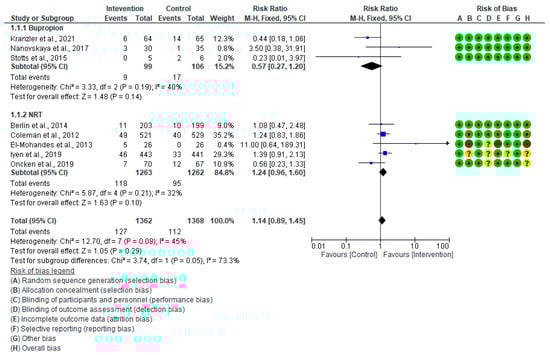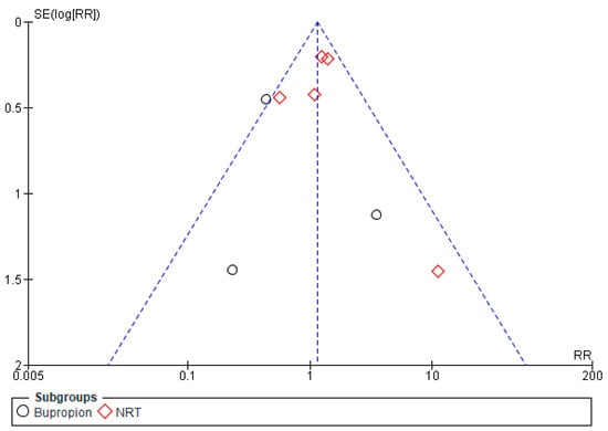 Eight studies’ pooled results [28,29,30,31,32,33,34,35] showed inconclusive differences in smoking abstinence among the pregnant women in both pharmacological and placebo groups (Risk Ratio (RR): 1.14, 95% CI: 0.89–1.45, p = 0.29), as shown in Figure 2. According to subgroup analysis, the results from five studies [28,29,30,31,32] demonstrate that the NRT group’s smoking cessation was marginally higher than that of the placebo group; however, this difference was not statistically significant (RR: 1.24, 95% CI: 0.96–1.60, p = 0.10). The data from three studies [33,34,35] showed that bupropion had no significant effect on the intervention group’s smoking abstinence when compared to the control group (RR: 0.57, 95% CI: 0.27–1.20, p = 0.14) (Figure 2). The overall heterogeneity (I2) between the studies included in the analysis was 45%. Eliminating Nanovskaya et al. (2017) [34] reduced I2 in the sensitivity analysis for bupropion from 40% to 0%, while excluding Oncken et al. (2019) [32] lowered I2 in the sensitivity analysis for NRT from 32% to 0%. However, overall, I2 for pharmaceutical intervention remained unaltered. Egger’s test for bupropion and NRT (p = 0.47 and 0.80) and the funnel plot for pharmaceutical therapies, as shown in Figure 3, also demonstrated that publication bias was absent. NRT and bupropion have a moderate GRADE level of evidence (Supplementary File S1).