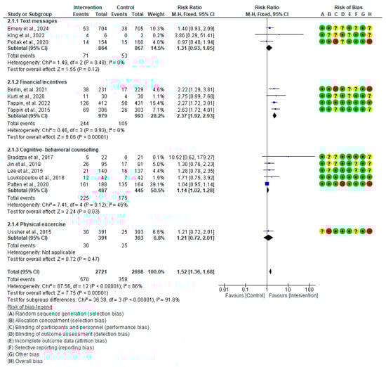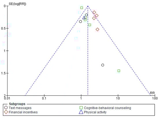 Thirteen RCTs [20,36,37,38,39,40,41,42,43,44,45,46,47] with a significant difference in smoking abstinence among pregnant women were included in a meta-analysis of all behavioral methods (RR: 1.52, 95% CI: 1.36–1.68, p < 0.001) (Figure 4). Subgroup analysis for each category reported that text message interventions [36,37,38] among pregnant smokers (n = 864) had no significant difference from controls (n = 867) in smoking quitting (RR: 1.31, 95% CI: 0.93–1.85, p = 0.12); however, pregnant smokers (n = 979) who received financial incentives [43,44,45,46] had a significant difference from controls (n = 993) (RR: 2.37, 95% CI: 1.92–2.93, p < 0.001). Additionally, a meta-analysis of cognitive-behavioral counseling [39,40,41,42,43] among pregnant smokers (n = 487) revealed a noteworthy distinction from controls (n = 445) (RR: 1.14, 95% CI: 1.02–1.28, p = 0.03). Interventions including text messages and financial incentives showed no heterogeneity (I2 = 0%), but cognitive-behavioral counseling showed moderate heterogeneity (I2 = 46%). One RCT for physical activity [20] was documented (RR: 1.21, 95% CI: 0.72–2.01, p = 0.47). Whereas the funnel plot for text messages and financial incentives showed a lack of publication bias (Egger’s test p-values = 0.69 and 0.74), it showed publication bias in cognitive-behavioral counseling studies (Egger’s test p-value = 0.003) (Figure 5). I2 dropped from 46% to 0% for the cognitive-behavioral therapy subgroup and from 86% to 40% for all behavioral therapies in the sensitivity analysis after deleting Patten et al. (2020) [47]. According to the GRADE level of certainty, financial incentives had a high degree, while text messages and cognitive-behavioral counseling had a moderate level, and physical exercise had a low one (Supplementary Files S1).