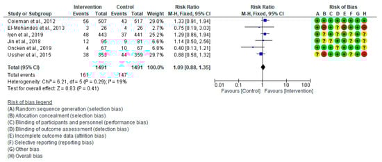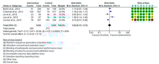 When comparing the intervention group to the control group, the meta-analysis results of five studies [20,28,30,44,45] indicated no significant difference in the rate of CS (RR: 1.06, 95% CI = 0.75–1.51, p = 0.73) (Figure 6). A significant amount of variation existed among the studies included in this analysis (I2 = 80%, p = 0.0005). By eliminating Ussher et al. (2015) [20] in the sensitivity analysis, I2 dropped from 80% to 72%, but it did not drop to 0% by eliminating any studies.