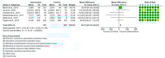 The pooled estimate of six trials [30,33,34,35,41,44] revealed that mothers in the intervention group gave birth to fetuses with significantly higher birth weight (MD = 94.73, 95% CI = (41.18–58.27), p = 0.000) (Figure 7). There was no significant variation among the trials included in this analysis (I2 = 0.0%, p = 0.63).