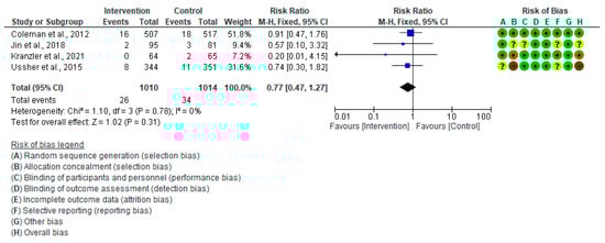 Forest plot of Apgar score < 7 (5 min): Coleman et al., 2012 [28], Jin et al., 2018 [44], Kranzler et al., 2021 [35], Ussher et al., 2015 [20].