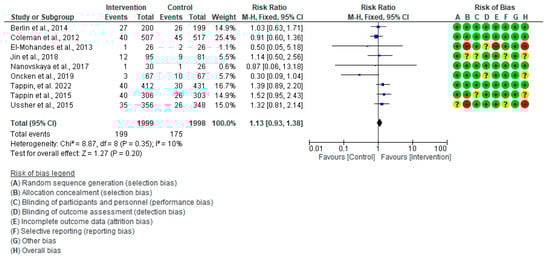 The meta-analysis of nine studies [20,28,29,30,32,34,41,42,44] found an inconclusive impact of the intervention or control measures on the incidence of preterm birth among the groups under study (RR: 1.13, 95% CI = 0.93–1.38, p = 0.20); there was low insignificant heterogeneity in the analysis (I2 = 10%, p = 0.35) (Figure 10). When Oncken et al. (2019) [32] were removed in the sensitivity analysis, I2 plummeted from 10% to 0%.